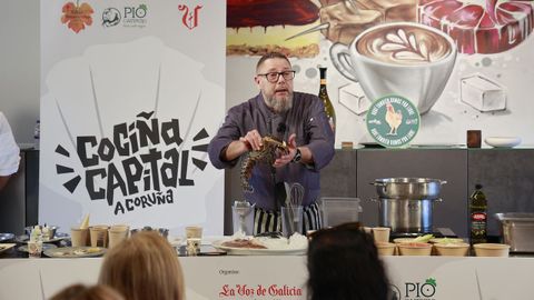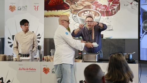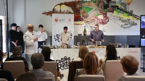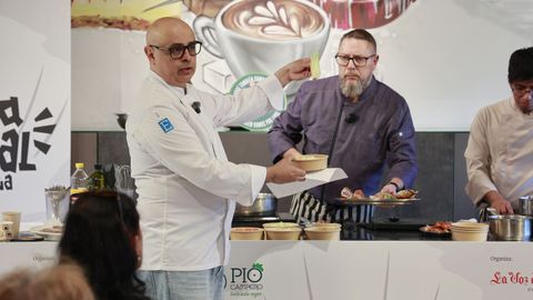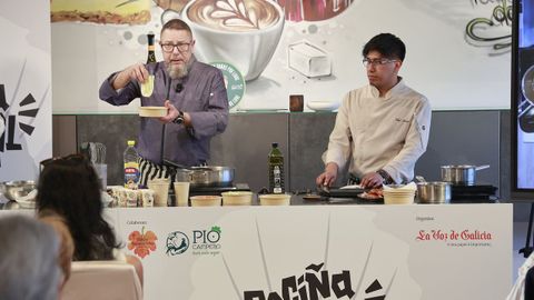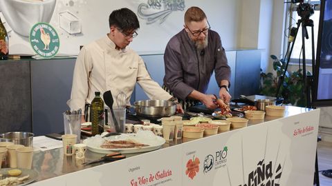 En la tarde de ayer, una treintena de suscriptores de La Voz de Galicia pudieron asistir a una clase magistral de ambos en una nueva edición del ciclo Cociña Capital, celebrado en el CIFP Paseo das Pontes. Por mantenerse fieles al diccionario y al letrero de su cotizado establecimiento, los cocineros desplegaron y desmigajaron dos recetas de mescolanza a la vez sencilla y vanguardista —«lo que hoy consideramos tradicional es lo que superó los prejuicios del pasado», recordó Musso—.