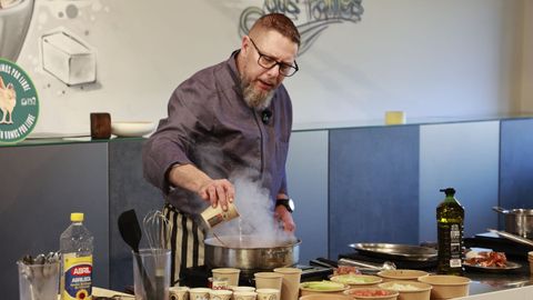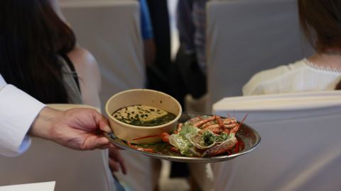 El segundo plato fue un bisqué de bogavante. Al comienzo del proceso de confección, el animal aún pataleaba torpe e inútilmente sobre la encimera. No sin motivo. Chicón puntualizó que, idealmente, la receta debe elaborarse con el bicho aún vivo, para mantener el frescor en la carne. Los más aprensivos, no obstante, pueden hacerlo también después de la defunción. La pérdida de sabor no es mayúscula y la escena resulta algo menos tétrica.