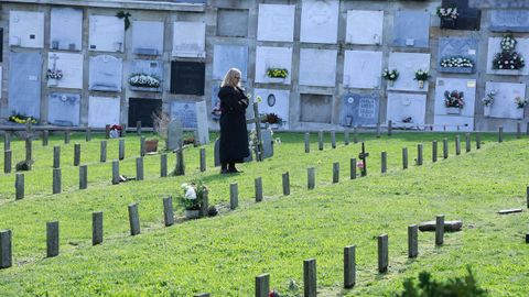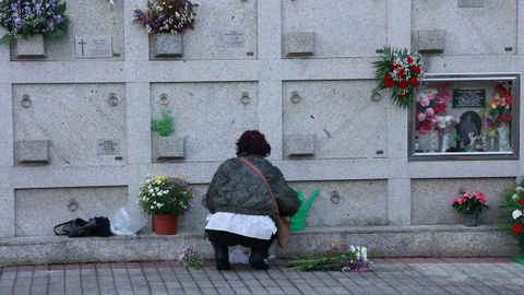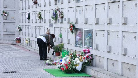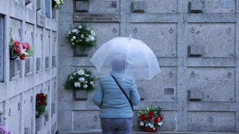 Pero non se circunscribiu a San Amaro o sobordar dos afectos. Tamén por Feáns, San Pedro de Visma desfilaron os pétalos e os suspiros. E en Oza, claro. Aí estaba, preto das dúas da tarde e coa choiva aguilloando retadoramente, Pochi. Unha muller que entende mellor que ninguén o espírito real da data. «Non son de vir só nesta época. Pode parecer unha bobada, e a min mesma parecíamo de pequena, pero co tempo foime gustando cada vez máis acudir aos cemiterios para visitar aos meus seres queridos». Regadera en man e sorriso en rostro, acicala o ramo que alegrará o gris do nicho do avó do seu esposo. Pero ten que engadir un matiz, para que non haxa malentendidos. «Imos ver a todos os nosos familiares, que están distribuídos entre San Amaro e Oza, e a todos deixámoslles exactamente as mesmas flores para que non teñan envexa os uns dos outros». E, despois de dicir isto, ensancha aínda un pouco máis o seu sorriso e volve ao seu feliz labor. Morren os corpos, pero non morre a memoria.