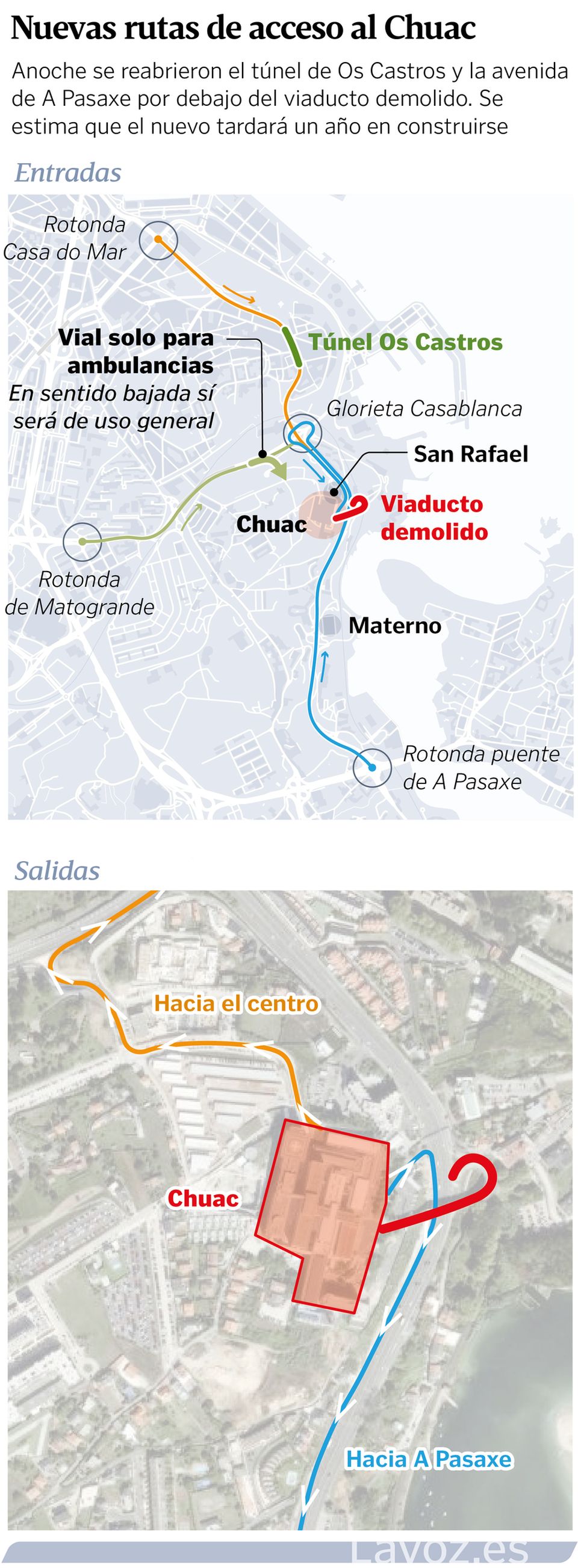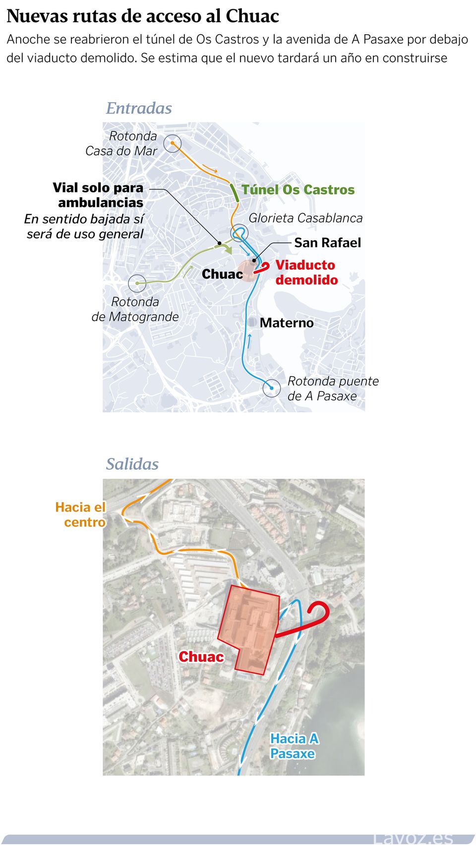 Unha vez reaberta a avenida da Pasaxe, o tráfico non recuperará totalmente a normalidade da semana pasada. Aínda que xa non está cortado tampouco o túnel de Vos Castros, polo que xa non hai que seguir o itinerario recomendado desde a Casa do Mar pola estrada do porto, agora xa non hai escaléxtric e tardarán un ano en pór o novo. Ata entón, se se vén desde a rotonda da Pasaxe, para chegar ao hospital haberá que seguir ata a glorieta de Casabranca, cambiar de sentido e subir pola AC-12 para coller a costa cara ao Chuac.