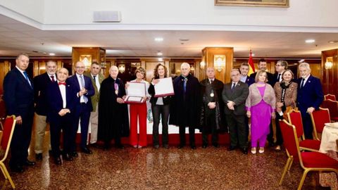 09 nov 2025 . Actualizado á 05:00 h.Eladio Cuíña Crespo, licenciado en Ciencias Económicas e director xeral e cofundador da empresa lalinense Inasus, e Jesús López Cuñarro, o xefe da Policía LKocal de Lalín, xubilado, xunto a outras oito personalidades civís e militares de diversos puntos de España, ingresaron como damas e cabaleiros de «La muy serena y muy noble Orden de la Amistad», que celebrou o seu Capítulo Anual número 99, o pasado xoves en Madrid, onde ten a súa sede social. As distincións, consistentes nunha insignia en prata co logotipo da Orden e un exemplar dos estatutos da mesma, forónlles entregadas polo mestre presidente da asociación, Arturo Espejo Valero, o secretario Pedro Sanz Bachiller, e varios directivos, entre eles o coñecido xornalista Rodrigo Ramos, delegado da RTVG e presidente da Casa de Galicia en Madrid, ataviados todos eles coas capas negras, que son a indumentaria que os distingue.
