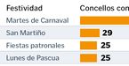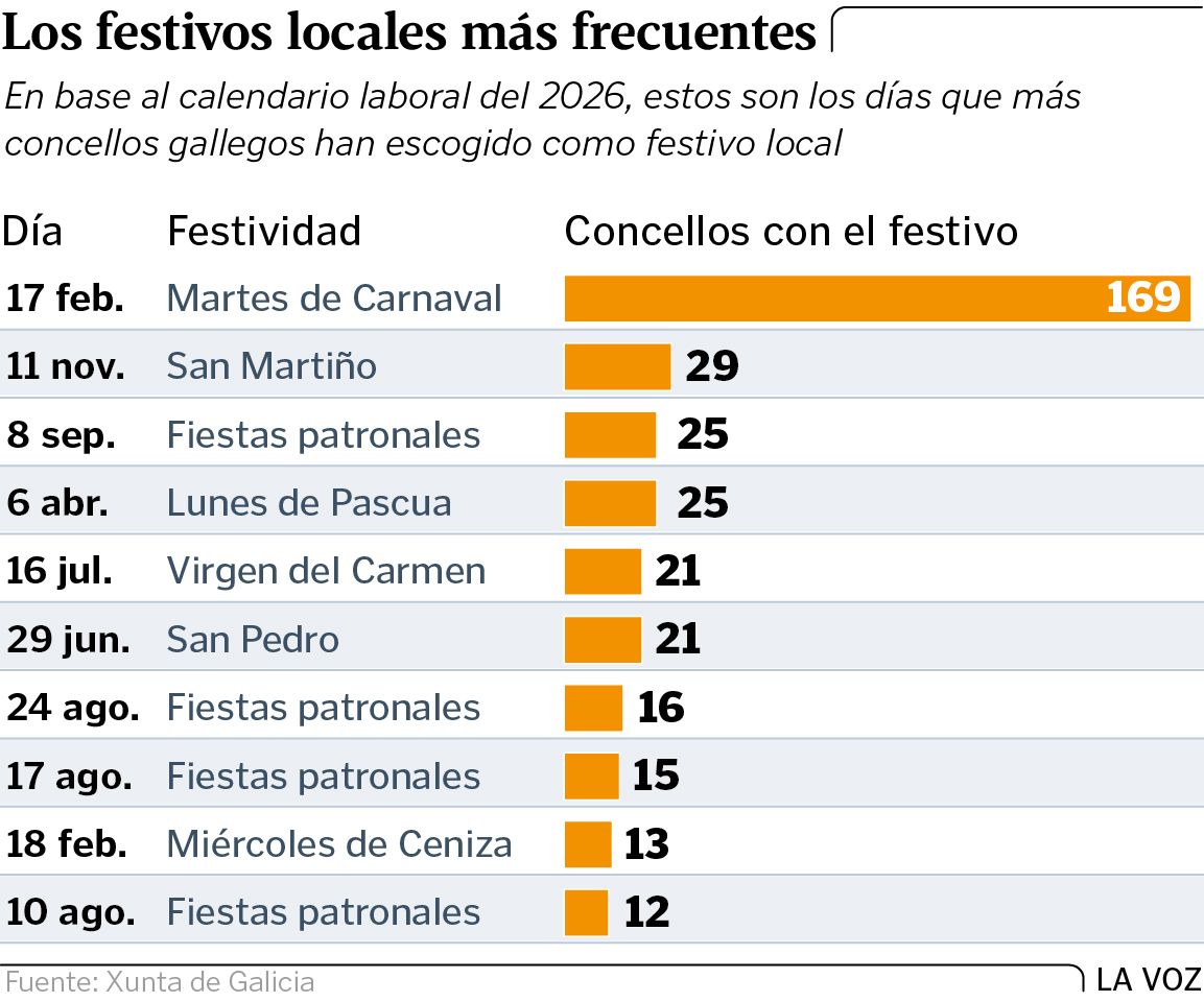 Como suele ser habitual, el Carnaval sigue siendo la festividad más popular entre los municipios gallegos. Un total de 169 —más de la mitad— han decidido declarar festivo el Martes de Entroido (17 de febrero). Los vecinos de A Coruña, Lugo, Ourense y Santiago de Compostela (renuncia a San Roque, el 16 de agosto, por caer en domingo) no tendrán que acudir ese día al trabajo.