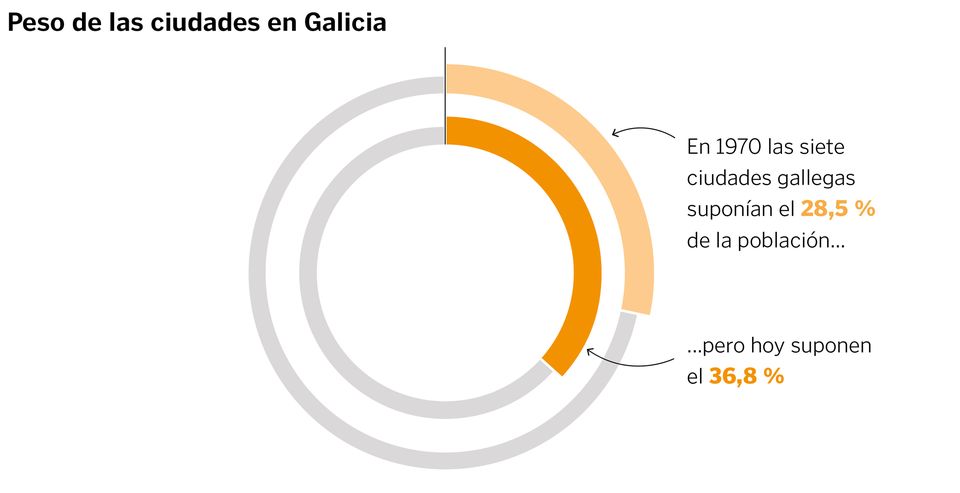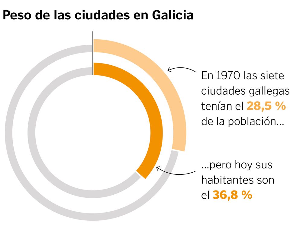 En Galicia, a medidados dos setenta, as sete urbes principais —Vigo, A Coruña, Santiago, Pontevedra, Ferrol, Ourense e Lugo— reunían ao 28,5% da poboación galega. Hoxe, esa porcentaxe subiu ao 36,8%. Desas sete cidades, só Ferrol viu minguar os seus veciños: en 1975 contaba con 87.736 habitantes e hoxe son 64.218.
