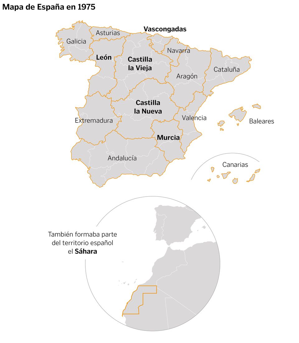 Pouco parécese este país con aquel que Franco deixou na súa morte, en 1975. A distancia coa España do ditador pode medirse en moitas cousas, pero poucas tan reveladoras como a organización do territorio. Entón non existían as comunidades autónomas, nin o debate sobre o autogoberno, nin a idea mesma dunha España plural. Galicia estaba no mapa, pero só en forma de rexión, sen competencias políticas sobre si mesma. Unha estrutura herdada do século XIX cando en 1833 a Javier de Burgos — un lingüista, historiador e político da época— encargáronlle a división civil de cada quilómetro do noso país. Cincuenta provincias tiña España en 1975 agrupadas en 16 rexións. Non existían nin Castela e León nin Castela-A Mancha, senón Castela a Vella e Castela a Nova. Dentro desta última estaba Madrid, unha cidade sen autonomía nin parlamento, pero que concentraba todo o poder político do Estado franquista. Coa democracia, Madrid mantivo a capitalidade, pero o resto do territorio empezou, por fin, a ter voz.