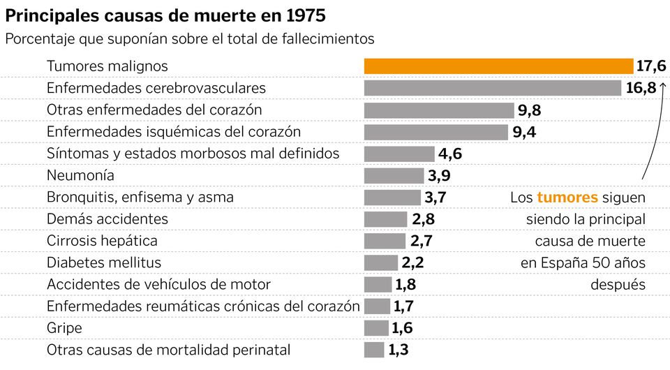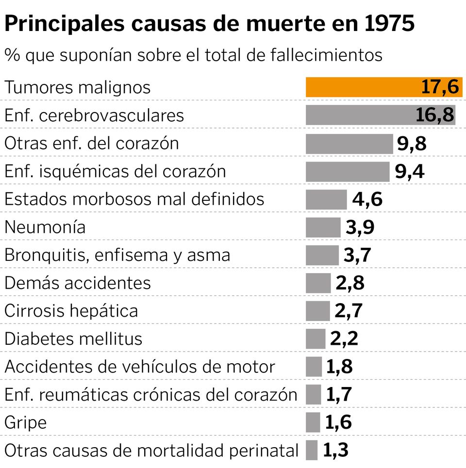 Algo que cambiou menos en todo este tempo é de que morremos. A pesar do imparable avance da ciencia e o medicamento nos últimos cincuenta anos, que nos permitiu vivir máis e mellor, os tumores seguen sendo a principal causa de morte en España. En 1975, un 16% dos falecementos debíanse a enfermidades cerebrovaculares e outro 18% a enfermidades relacionadas co corazón. Un esquema practicamente idéntico ao que o INE recolle na actualidade.