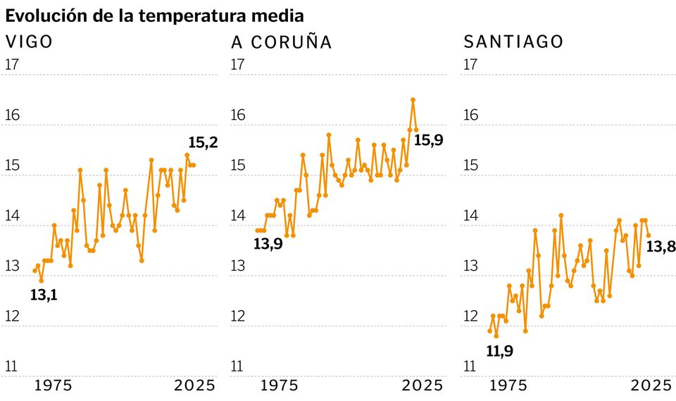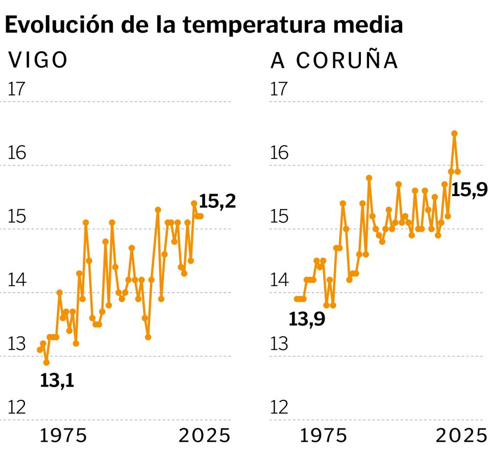Entre as evidencias científicas máis incontestables que nos deixou este medio século está o cambio climático. O mundo está a quentarse. Cada verán de marca, cada seca prolongada e cada vaga de incendios lémbrannolo. Os indicadores non enganan: a temperatura media das principais cidades galegas aumentou dous graos nos últimos cincuenta anos.