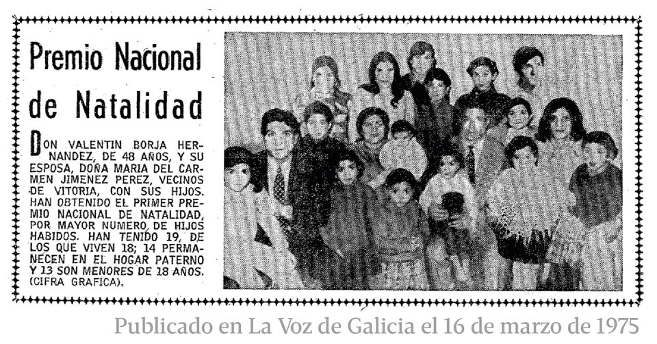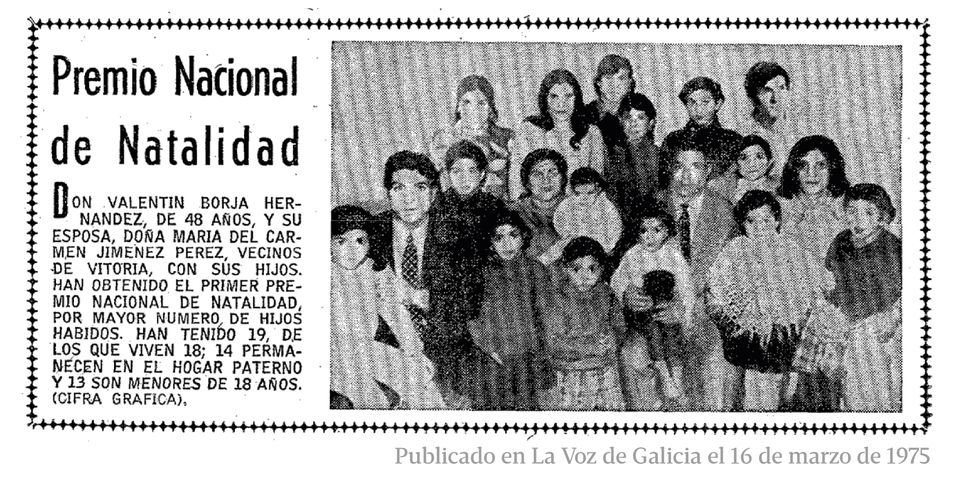 O 16 de marzo de 1975, La Voz informaba de que un matrimonio de Vitoria habíase alzado co primeiro premio despois de traer ao mundo 19 vástagos. Os excéntricos galardóns resistiron algúns anos máis. En 1976, foi o rei Juan Carlos quen entregou o primeiro Premio de Promoción Familiar a unha viúva compostelá de 59 anos que criaba a nove fillos. O galardón recoñecía a capacidade de sacar adiante a un maior número de descendentes. A noticia aparecía así nas páxinas de La Voz: «Dos nove fillos habidos, un é doutor, tres son licenciados, catro estudan licenciatura e un faleceu».