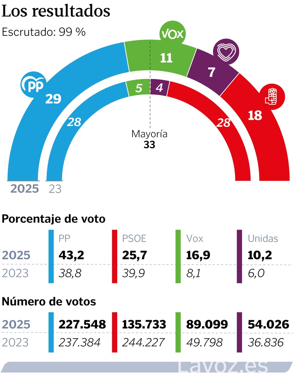 22 dic 2025 . Actualizado á 07:41 h.O PP gañou este domingo as eleccións en Estremadura situándose no segundo mellor dos escenarios que contemplaba, ao obter máis votos e escanos que toda a esquerda. A candidata popular, María Guardiola, queda lonxe da ansiada maioría absoluta, pero con 228.300 votos obtén 29 escanos, un por amais dos 28 que logrou no 2023, e un 43,2 % dos sufraxios. Un resultado co que á candidata do PP abondaríalle a abstención de Vox, que logra once deputados, para ser investida.