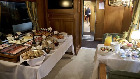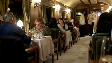 Madeira por todas as partes, antigos letreiros que homenaxean a compañas e construtoras ferroviarias da España industrial e de Rusia decoran o tren xunto a lámpadas de cálida luz e inspiración art déco. Todo harmoniza cunha máis que aceptable cobertura da internet que permite traballar con amplitude nas mesas que ao almorzo e á cea convértense nas protagonistas dunha das guindas da viaxe: a gastronomía, con menús que están á altura e que incluso superan as comidas en restaurantes externos, seleccionados pola súa calidade e pola súa localización en plena ruta turística.