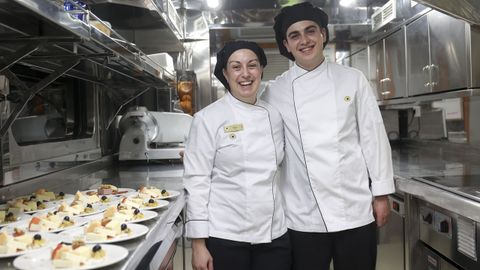 Mentres os viaxeiros gozan, o persoal non para, e en cociña reciben os produtos, todos de proximidade, ou achéganse a puntos de venda seleccionados. «O cliente sempre nos adoita comentar que se come moito mellor a bordo que en restaurantes externos e, a verdade, isto énchenos de orgullo moito porque temos condicións moito máis difíciles», resume Elena mentres Nerea e Juan respiran tranquilos tras concluír a cea do último día e ver que os pratos lles chegan limpos. Nerea Fernández, con dobre titulación en cociña, suma a súa terceira tempada sobre raís tras anos de esixente experiencia traballando en restaurantes de dúas estrelas Michelín. Juan Sánchez fíxose cociñeiro a base de práctica e ante a experiencia case parece un viaxeiro: «Vívese moi ben, traballar con movemento parece moito máis difícil, pero faste a iso».