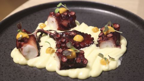 De ahí que no sorprenda el plato que proponen para estas líneas: un pulpo de las rías gallegas adquirido en esa plaza de abastos, acompañado de un parmentier (en francés, crema o puré de patata) con queso de Denominación de Origen Protegida San Simón y una emulsión de ajada. «En vez de un pulpo a la gallega de toda la vida con aceite de oliva, pimentón y la patata cocida, lo presentamos de una forma más actual; eso es lo que solemos hacer con todos nuestros platos: darle un toque más moderno, pero sin dejar de cuidar el producto», explica Queco. Una característica que, según sus palabras, también se valora más por parte de los comensales. «Al igual que se le da más importancia a las denominaciones de origen, ya sea, por ejemplo, de un vino o un queso, como en este caso».