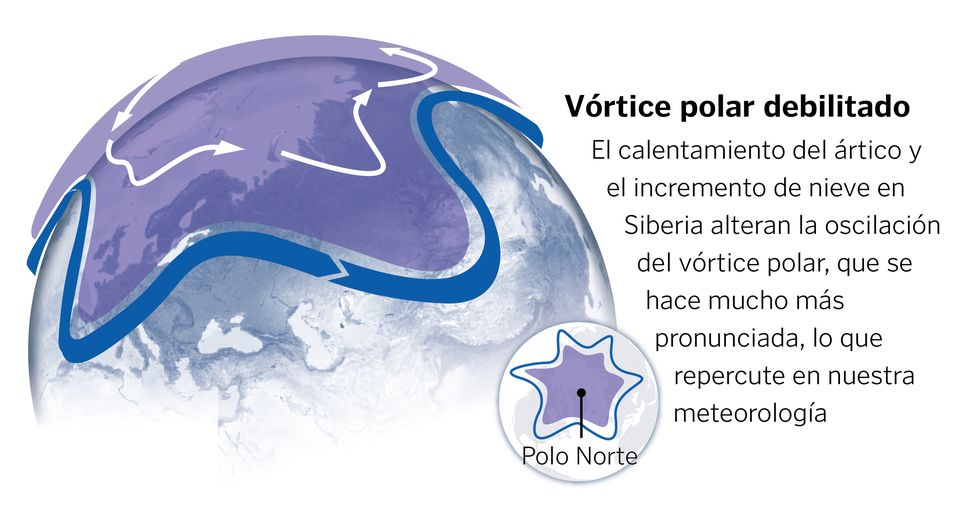 O anticiclón siberiano pode debilitar o vórtice polar, o cinto de ventos que hai na alta atmosfera do Ártico e que confina un aire extremadamente frío.
