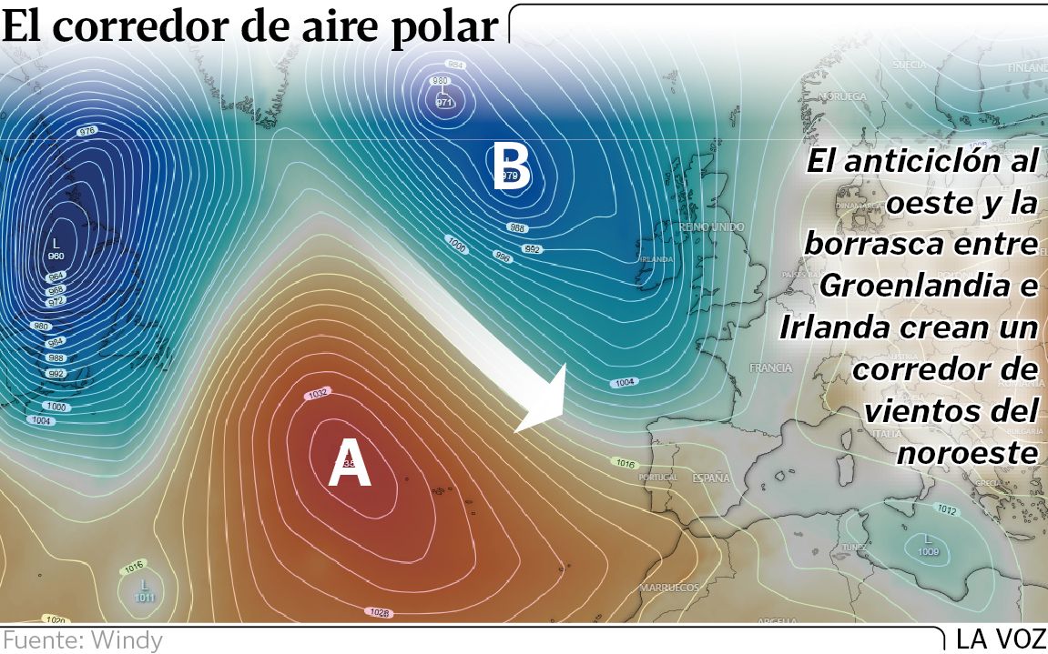 Mañá sábado asoma unha borrasca procedente de Groenlandia. Trae unha fronte que atravesará a comunidade a partir do mediodía. As precipitacións serán localmente intensas nas provincias atlánticas. Ademais, debido á posición do anticiclón ao oeste da Península e da borrasca ao norte, se creará un corredor que vai canalizar unha masa de aire polar marítimo cara á comunidade galega. Pola tarde, as choivas presentaranse en forma de neve a partir dos 1.000 metros de altura, pero a cota irá descendendo de xeito progresivo ata os 600 metros de altura durante as últimas horas do día. As temperaturas volverán descender de xeito xeneralizado no caso das mínimo, sobre todo no interior.