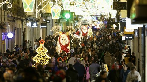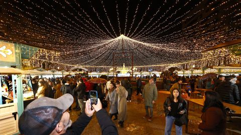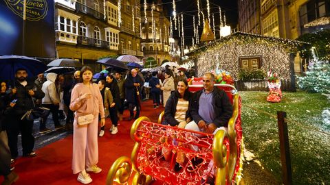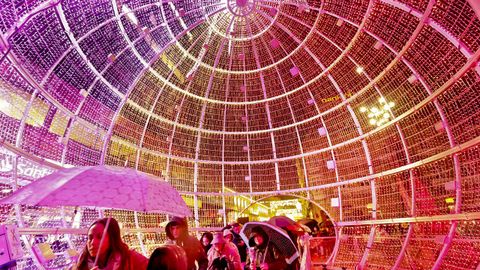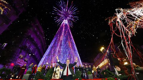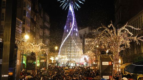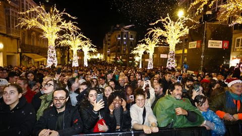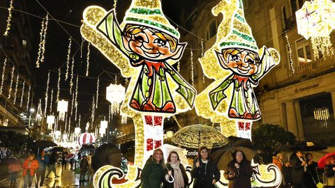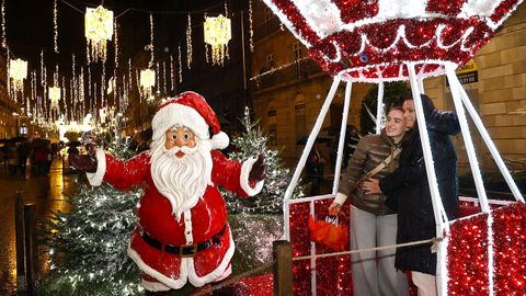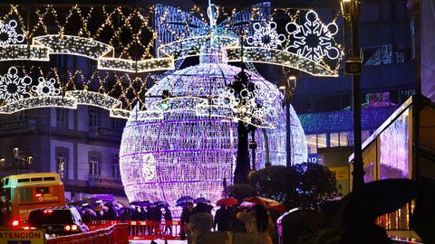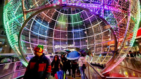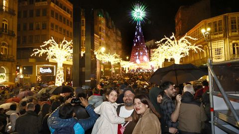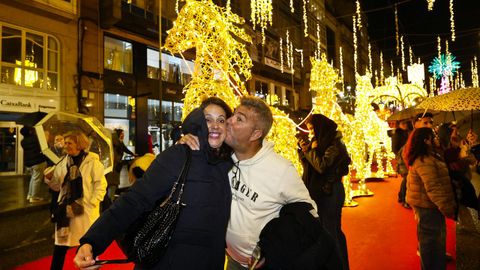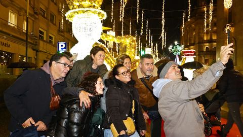 A inauguración de onte á noite deixou claro que a cidade mantén a súa vontade inesgotable de cegar. O acto volveu marcar o inicio oficioso do inverno cun aceso monumental: doce millóns de luces led e 460 rúas decoradas. A cidade engalanada converteuse en todo un referente turístico para o goce do público familiar e de visitantes, como José Raúl Ramos e Ingrid Davide, que durante os últimos oito anos demostraron plena lealdade ao aceso. Onte pola tarde, el saíu correndo en canto os axentes de seguridade retiraron os valos para o acceso do público. «Levo catro horas agardando baixo a choiva e o vento. Pero aquí estamos», recoñecía feliz. Este ano, convenceron a súa sobriña para que viñese desde Honduras a gozar do espectáculo.