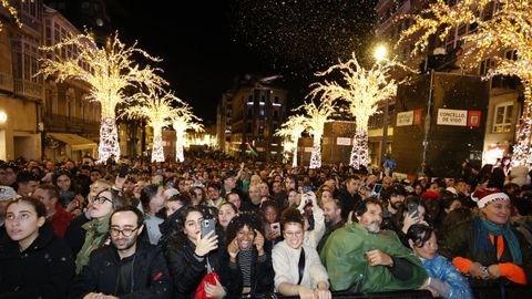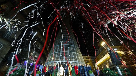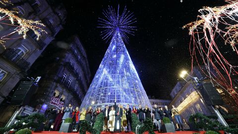 O abeto xigante da Porta do Sol iluminouse e soaron os acordes de Lennon. Á segundo, xa si, quedou inaugurada o Nadal de Vigo. O alcalde volveu posar para os fotógrafos diante da árbore, agora iluminado, mentres chovía confeti de cores vermello e branco sobre o escenario e neve artificial. «Imos! Encántame!», clamaba o rexedor mentres os concelleiros, detrás, abrazábanse gozando do espectáculo ao son do beatle. «É a mellor do planeta», engadía sen ruborizarse.