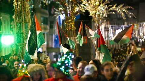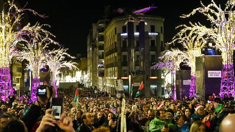 Máis sorte houbo co tempo. Un pouco antes das 20.00, hora na que estaba convocada toda a cidade para iluminarse, os ceos despexáronse para que Vigo volvese brillar en todo o seu esplendor. O monólogo da choiva deu paso ao monólogo de Abel Caballero, que despois de saudar a «todas as mulleres e os homes» da cidade, «especialmente aos máis mozos», dedicou unhas palabras a un grupo de persoas que portaban pacificamente bandeiras de Palestina entre a multitude congregada fronte á árbore do Nadal. «Sempre estaremos ao lado dos que teñen a razón, ao lado da xente de Gaza. Vigo sempre estará aí», aseverou.