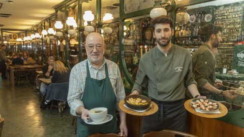 O Café Paradiso cumprirá medio século o próximo ano. Agustín Ares, o seu propietario, fíxose coas rendas tal día como onte, pero de 1991, e entón decidiu que non había nada que cambiar no deseño retros que ideara o decorador Ventura Cores. Os seus espellos queimados con sal e as carpinterías curvas pintadas de verde son o aceno de identidade dun local que ten unha modesta entrada na Rúa do Vilar. No imaxinario de moitos composteláns trátase dun bo lugar para tomar un café ou un chocolate con churros, pero baixo a xestión de Agustín, da súa muller Socorro e do seu fillo Pablo, que xa estudou no Centro Superior de Hostalería, conseguiron facerse un oco entre as cociñas máis apreciadas da cidade (no posto 17 en TripAdvisor) mantendo uns prezos razoables. É certo que cando revisas os comentarios nas páxinas máis populares os clientes encomian moito a súa calidade gastronómica, pero máis aínda a amabilidade da familia propietaria. «Algo ben estaremos facendo», resume con humildade o hostaleiro nado no Pino, que xa está a acariñar a idade da xubilación.