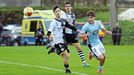 El central se anticipa con la cabeza para evitar la carrera al espacio de Adrián Liso.
