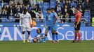 O madrileño intenta enviar o balón á área pero cede un saque de banda.