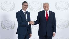 Catro días despois de que expuxese a saída de España da OTAN, o presidente estadounidense agardou cun sorriso a Sánchez, ambos estreitaron as súas mans e o presidente do Goberno español devolveu tamén o sorriso mentres intercambiaban un breve comentario. Logo, no seu discurso, preguntou polo gasto en defensa: «Estades xa traballando no tema do PIB? Achegarémonos»